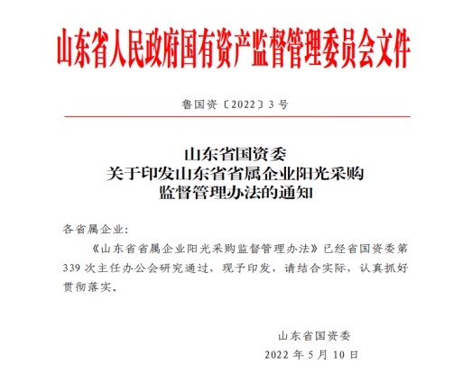 2022年5月16日,山東省國資委正式發(fā)布《山東省省屬企業(yè)陽光采購監(jiān)督管理辦法》(以下簡稱:《管理辦法》),對進(jìn)一步加強(qiáng)國有企業(yè)陽光采購工作作出部署安排。